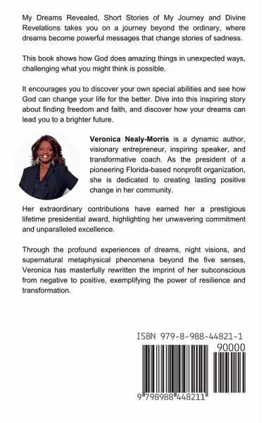 My Dreams Revealed, Short Stories of My Journey and Divine Revelations takes you on a journey beyond the ordinary, where dreams become powerful messages that change stories of sadness. This book shows how God does amazing things in unexpected ways, challenging what you might think is possible. It encourages you to discover your own special abilities and see how God can change your life for the better. Dive into this inspiring story about finding freedom and faith and discovering how your dreams can lead you to a brighter future. Veronica Nealy-Morris is a dynamic author, visionary entrepreneur, inspiring speaker, and transformative coach. As the president of a pioneering Florida-based nonprofit organization, she is dedicated to creating lasting positive change in her community. Her extraordinary contributions have earned her a prestigious lifetime presidential award, highlighting her unwavering commitment and unparalleled excellence. Through the profound experiences of dreams, night visions, and supernatural metaphysical phenomena beyond the five senses, Veronica has masterfully rewritten the imprint of her subconscious from negative to positive, exemplifying the power of resilience and transformation.
