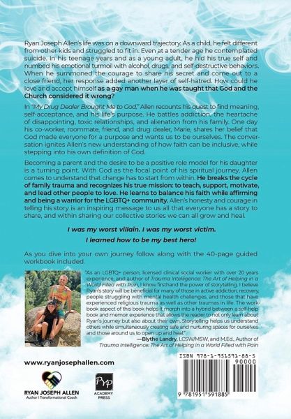 Ryan Joseph Allen's life was on a downward trajectory. As a child, he felt different from other kids and struggled to fit in. Even at a tender age he contemplated suicide. In his teenage years and as a young adult, he hid his true self and numbed his emotional turmoil with alcohol, drugs, and self-destructive behaviors. When he summoned the courage to share his secret and come out to a close friend, her response added another layer of self-hatred. How could he love and accept himself as a gay man when he was taught that God and the Church considered it wrong? In "My Drug Dealer Brought Me to God," Allen recounts his quest to find meaning, self-acceptance, and his life's purpose. He battles addiction, the heartache of disappointing, toxic relationships, and alienation from his family. One day his co-worker, roommate, friend, and drug dealer, Marie, shares her belief that God made everyone for a purpose and wants us to be ourselves. The conversation ignites Allen's new understanding of how faith can be inclusive, while stepping into his own definition of God. Becoming a parent and the desire to be a positive role model for his daughter is a turning point. With God as the focal point of his spiritual journey, Allen comes to understand that change has to start from within. He breaks the cycle of family trauma and recognizes his true mission: to teach, support, motivate, and lead other people to love. He learns to balance his faith while affirming and being a warrior for the LGBTQ+ community. Allen's honesty and courage in telling his story is an inspiring message to us all that everyone has a story to share, and within sharing our collective stories we can all grow and heal. I was my worst villain. I was my worst victim. I learned how to be my best hero! As you dive into your own journey follow along with the 40-page guided workbook included.