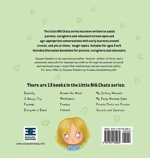 This title explores children's Early Warning Signs. Adults and children alike all experience these signs when they feel unsafe, worried, scared and/or excited. Helping children to understand our body's natural reaction to feeling unsafe and alerting them to know exactly what to do is empowering. Discussion questions for parents, caregivers and educators included. Suitable for ages 2 to 6. This book is part of the Little BIG Chats series. The Little BIG Chats series has been written to assist parents, caregivers and educators to have open and age-appropriate conversations with early learners around crucial, and yet at times, 'tough' topics. And what better way than using children's picture books! Some pages will have questions for your child to interact with and discuss. Feel free to use these questions and the Discussion Questions provided on the inside back cover of each book to help you assist your child with the topic being explored. Stop at any time to unpack the text together; and try to follow your child's lead wherever that conversation may take you! Suitable for ages 2 to 6. There are 12 books in the Little BIG Chats series: * Empathy: Exploring the meaning of empathy and kindness * I Always Try: Developing a growth mindset of resilience and persistence * Feelings: Understanding different feelings and emotions * Everyone is Equal: Introducing the importance of gender equality and diversity * Around the World: Celebrating the importance of racial equality and diversity * Mindfulness: Exploring the importance of mindfulness and learning calming skills * Families: Celebrating diversity in families * Consent: Introducing consent and body boundaries * My Safety Network: Introducing a Safety Network (3 to 5 trusted adults a child can go to if they feel unsafe) * My Early Warning Signs: Exploring Early Warning Signs and what to do if a child experiences these signs * Private Parts are Private: Learning private parts are private and what to do if touched inappropriately * Secrets and Surprises: Learning the difference between secrets and surprises The Body Safety titles should ideally be read in the following order: Consent, My Safety Network, My Early Warning Signs, Private Parts are Private, and Secrets and Surprises. The remaining titles can be read in any order.