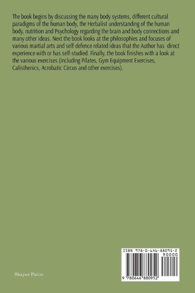 The book begins by discussing the many body systems, different cultural paradigms of the human body, the Herbalist understanding of the human body, nutrition and Psychology regarding the brain and body connections and many other ideas. Next the book discusses the philosophies and focuses of various martial arts and self-defence related ideas that the Author has direct experience with or have self-studied. Finally, the book finishes with a look at the various exercises (including Pilates, Gym Equipment Exercises, Calisthenics, Acrobatic Circus and other exercises).