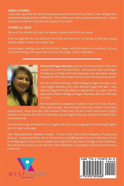FAMILY STORIES I can only say that we should treasure each moment of our lives. I am sitting here remembering about my childhood. Wow, there are many pleasant memories. Some are gone; however, they live very deep in my heart. STORIES or TALES Some of my stories will help my readers realize that life is too short. Even though this is a recollection of my life and others in my family, it will help young adults relate to their own family ties. As you begin reading, you will notice that I began with the history of my island. It is not only interesting, but important to know the origin of any individual... Norma Iris Pagan Morales was born in Ponce, Puerto Rico. She comes from a very lovable family. Her parents, Juan Jose Pagan Rodriguez, and Digna Morales Figueroa, now deceased, always helped her with her projects as a writer and teaching career. Norma had three siblings, Adelin Milagros Pagan Morales, Juan Jose Pagan Morales, and Julio Manuel Pagan Morales. Julio Manuel Pagan Morales died on September 19, 1998, and My dear sister Adelin Milagros Pagan Morales died on February 17, 2023. Norma did all her academic studies in New York City, Puerto Rico, and Canada. She worked in the City of New York Police Department. As an Educator, she worked in New York City Bd. of Education as an English Teacher, in Puerto Rico Bd. of Education as an English teacher and in the Puerto Rico Army National. She has teaching certifications for English as a Second Language and Teaching English as a Foreign Language. She had published thirteen books: Proud of My Puerto Rican Bequest, ¿Porque Soy Boricua? Poemas del Alma, Art in Written Form, A Baffl ing Short Stories Collection, On Job in the Big Apple, Puerto Rican Soldiers Serving with Pride, Nature's Rage in the Caribbean, Boricua de Pura Cepa, You are the One, The Unfaithfuls, Christopher Columbus and Violence in the City.