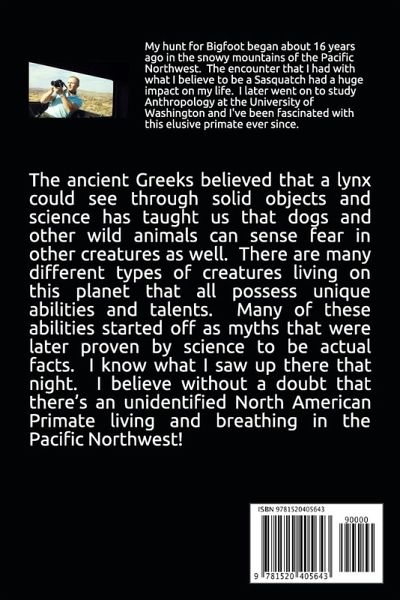 This book talks about my encounter that I had with a Sasquatch while bow hunting in the Pacific Northwest. I dive into the heart of the Mystery that surrounds the Legend of Bigfoot by separating fact from common misconceptions. I also discuss a few popular theories on Infra sound, vocalizations, dermal ridge patterns, Migratory patterns of a Sasquatch and much more. I've studied this large, elusive primate for many years and for the first time, I've decided to share my findings with the public! Have you ever wondered why so many people believe in Bigfoot but can't figure out why there lacks any major hard evidence? Why are they so elusive and is there any hard forensic evidence that supports any real popular theories? Do you think we have an Unidentified North American Primate that's living and breathing in the Pacific Northwest? Read this book and and decide for yourself!