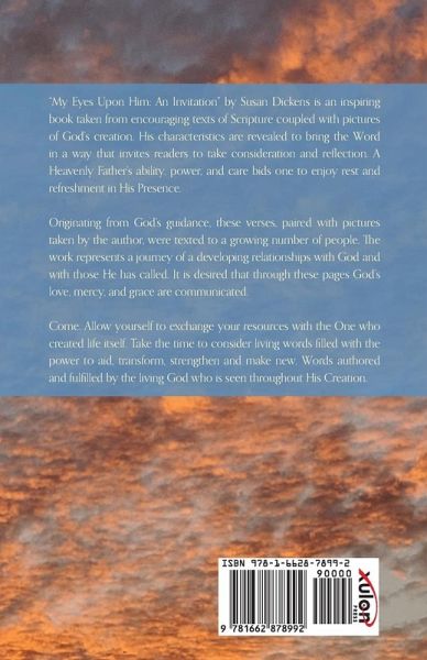 "My Eyes Upon Him: An Invitation" by Susan Dickens is an inspiring book taken from encouraging texts of Scripture coupled with pictures of God's creation. His characteristics are revealed to bring the Word in a way that invites readers to take consideration and reflection. A Heavenly Father's ability, power, and care bids one to enjoy rest and refreshment in His Presence. Originating from God's guidance, these verses, paired with pictures taken by the author, were texted to a growing number of people. The work represents a journey of a developing relationships with God and with those He has called. It is desired that through these pages God's love, mercy, and grace are communicated. Come. Allow yourself to exchange your resources with the One who created life itself. Take the time to consider living words filled with the power to aid, transform, strengthen and make new. Words authored and fulfilled by the living God who is seen throughout His Creation.