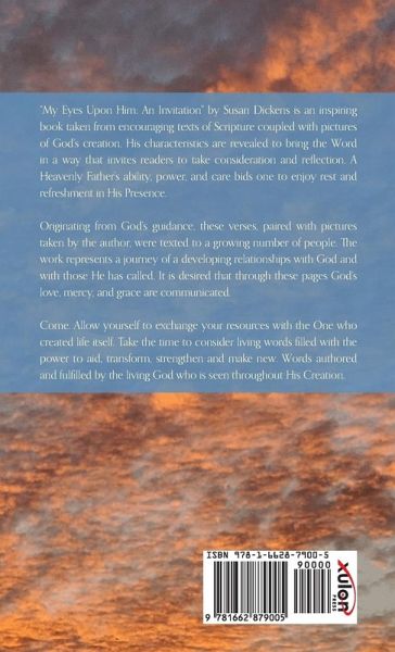 "My Eyes Upon Him: An Invitation" by Susan Dickens is an inspiring book taken from encouraging texts of Scripture coupled with pictures of God's creation. His characteristics are revealed to bring the Word in a way that invites readers to take consideration and reflection. A Heavenly Father's ability, power, and care bids one to enjoy rest and refreshment in His Presence. Originating from God's guidance, these verses, paired with pictures taken by the author, were texted to a growing number of people. The work represents a journey of a developing relationships with God and with those He has called. It is desired that through these pages God's love, mercy, and grace are communicated. Come. Allow yourself to exchange your resources with the One who created life itself. Take the time to consider living words filled with the power to aid, transform, strengthen and make new. Words authored and fulfilled by the living God who is seen throughout His Creation.