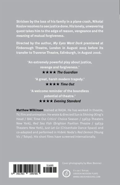 "He commanded those pilots to dive. To ignore their screens and fly into each other. Whatever the reasons." Stricken by the loss of his family in a plane crash, Nikolai Koslov resolves to see justice done. His lonely, unwavering quest takes him to the edge of reason, vengeance and the meaning of mutual forgiveness. A taut, thrilling and contemporary tale, Matthew Wilkinson's new play brings to the stage the spare, emotional clout of a Greek tragedy. My Eyes Went Dark premiered at the Finborough Theatre, London in August 2015 and was nominated for three Off West End Awards including Best Play. It transferred to the Traverse Theatre, Edinburgh 2016 and 59E59 Theatres, New York 2017.