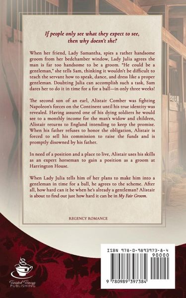 If people only see what they expect to see, then why doesn’t Julia Harrington? When her friend, Lady Samantha, spies a rather handsome groom from her bedchamber window, Lady Julia agrees the man is far too handsome to be a groom. "He could be a gentleman," she tells Sam, thinking it wouldn’t be too difficult to teach the servant how to speak and dance and dress like a gentleman. Doubting Julia can accomplish such a task, Samantha dares her to do just that—and in time for the Mayfield ball—in just three weeks! Alistair Comber, the second son of the Earl of Aimsley, was fighting Napoleon's forces on the Continent until his true identity was revealed. Having assured one of his dying soldiers he would see to a monthly income for the man’s widow and children, Alistair returns to England intending to keep the promise. His father refuses to honor the obligation, though, so Alistair is forced to sell his commission to help raise the funds. Angered that his son would do such a thing, the earl disowns Alistair. In need of a position and a place to live, Alistair uses his skills as an expert horseman to gain a position as a groom at Harrington House. When Lady Julia tells him of her plans to make him into a gentleman in time for the ball, Alistair agrees to the scheme. After all, how hard can it be when he’s already a gentleman? Alistair is about to find out just how hard it can be in My Fair Groom.