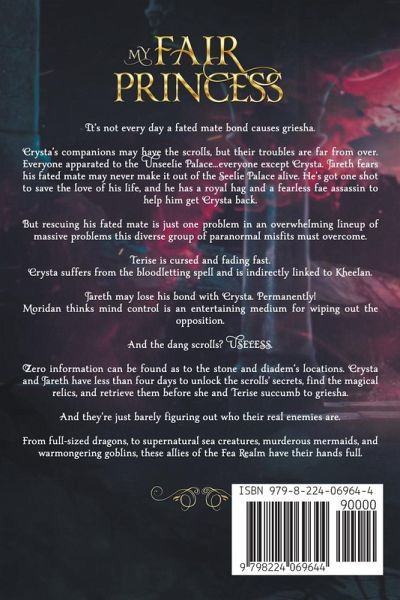 It's not every day a fated mate bond causes griesha. Crysta's companions may have the scrolls, but their troubles are far from over. Everyone apparated to the Unseelie Palace...everyone except Crysta. Jareth fears his fated mate may never make it out of the Seelie Palace alive. He's got one shot to save the love of his life, and he has a royal hag and a fearless fae assassin to help him get Crysta back. But rescuing his fated mate is just one problem in an overwhelming lineup of massive problems this diverse group of paranormal misfits must overcome. Terise is cursed and fading fast. Crysta suffers from the bloodletting spell and is indirectly linked to Kheelan. Jareth may lose his bond with Crysta. Permanently! Moridan thinks mind control is an entertaining medium for wiping out the opposition. And the dang scrolls? USELESS. Zero information can be found as to the stone and diadem's locations. Crysta and Jareth have less than four days to unlock the scrolls' secrets, find the magical relics, and retrieve them before she and Terise succumb to griesha. And they're just barely figuring out who their real enemies are. From full-sized dragons, to supernatural sea creatures, murderous mermaids, and warmongering goblins, these allies of the Fea Realm have their hands full. "The story avoids the stereotypical fairytale plot line, and once Crysta finds her fairy prince, all is not happily ever after, as the plot to assassinate Crysta is just the tip of the iceberg in a complicated, long played, and sinister plan created by unseen forces. Fans of fantasy, YA, fairies/fey, and clean romance will love this series!" Jennifer Earl, Amazon Reviewer