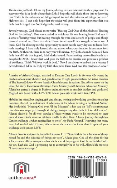 This is a story of faith. I'll use my Journey during medical crisis within these pages and for everyone who is in doubt about their faith; I hope this will shake them into to knowing that "Faith is the substance of things hoped for and the evidence of things not seen. Hebrews 11:1. I can only hope that the reader will grab from this experience that it is faith that I clanged too. So God gets the total victory. Several years ago, God blessed me to write "Hearing God Over all the Madness: Trusting God for Everything". That was a period in which my life was hearing from God, not in a sense of hearing voices but hearing through his word and actions of people and things situated around me. Since that time I have found myself in a struggle of some sort. I thank God for allowing me the opportunity to meet people every day and to learn from such meetings. I have truly learned that no matter what your situation is one must keep the faith. Without it, there is no way you will survive. My faith abounds because I have faith that all I do that is good, Faith doth abound. From making personalized cards to a Scrapbook DVD. I know that God gives me faith to be creative and produce a product of excellence. "Faith Without work is dead." Now I am about to embark on a journey I never dreamed I'd be in. Truly my faith abound as I hear God over this madness...Cancer!