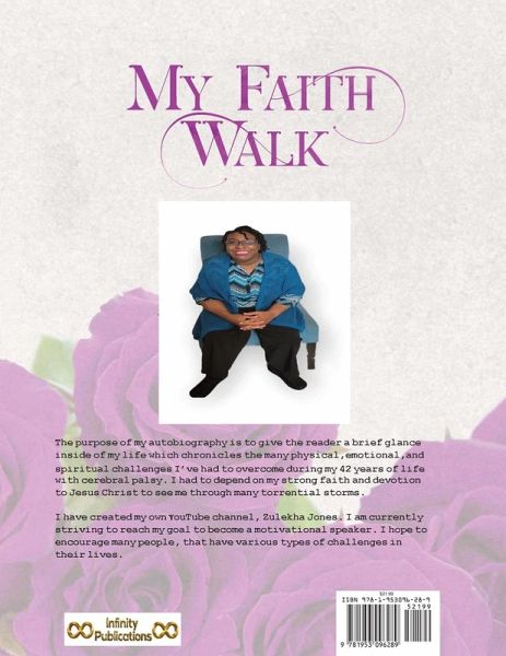 The purpose of my autobiography is to give the reader a brief glance inside of my life which chronicles the many physical, emotional, and spiritual challenges I've had to overcome during my 42 years of life with cerebral palsy. I had to depend on my strong faith and devotion to Jesus Christ to see me through many torrential storms. I have created my own YouTube channel, Zulekha Jones. I am currently striving to reach my goal to become a motivational speaker. I hope to encourage many people, that have various types of challenges in their lives.