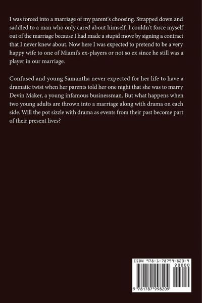 I was forced into a marriage of my parent's choosing. Strapped down and saddled to a man who only cared about himself. I couldn't force myself out of the marriage because I had made a stupid move by signing a contract that I never knew about. Now here I was expected to pretend to be a very happy wife to one of Miami's ex-players or not so ex since he still was a player in our marriage. Confused and young Samantha never expected for her life to have a dramatic twist when her parents told her one night that she was to marry Devin Maker, a young infamous businessman. But what happens when two young adults are thrown into a marriage along with drama on each side. Will the pot sizzle with drama as events from their past become part of their present lives?