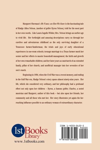 The fascinating tale of Madge Allen Nelson, mother of golfer Byron Nelson, told in her own words. Like Laura Ingalls Wilder, Mrs. Nelson brings an earlier age to vivid life. Beginning in 1894, when the Civil War was a recent memory, and ending in the Gulf War era, her story spans almost 99 years.