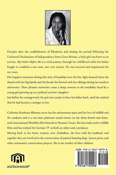Seventy years after the establishment of Rhodesia by the European settlers, a little girl was born to an activist. Her father fought to establish a one man, one vote system. He was arrested and imprisoned for ten years. The girl was ecstatic to have her father back until she realized that he had become a stranger to her. My Father before Me is a vivid journey through Catherine Kanhema-Blinston's early life. It chronicles her life in the midst of poverty, war, and prison camps. Her happiest moments during her childhood were the fun, light-hearted times she shared with her big family and the bonds she formed with her siblings during her outdoor adventures. These pleasant memories create a sharp contrast to the instability faced by a young girl growing up as a political activist's daughter.