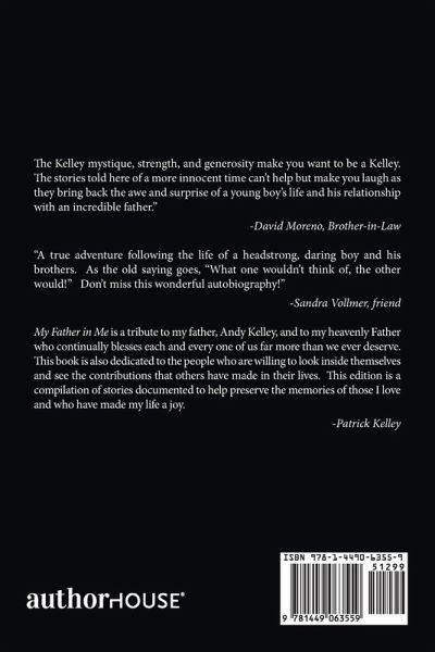 "My father in Me" is a compilation of stories experienced by Andy Kelley, former Underwater Demolition Team member (Navy Seal), and his son, Patrick Kelley. This book illustrates how the life of one person can positively influence multiple generations through example, word and intent. In turn, it helps us understand that we too, alter the lives of others as we interact in both positive and negative ways. "My Father in Me" also demonstrates how the "Kelley Mystique," a dangerous genetic trait, intrinsically motivates an individual to do some of the craziest things. This collection of life experiences, both humorous and heart-breaking, are wonderfully woven into a beautiful fabric called life. Each chapter, accentuated with a family picture, takes us step by step closer to our Heavenly Father through a deeper relationship with His Son, Jesus Christ. The book asks probing questions and addresses awkward life situations that are frequently avoided. Ultimately, "My Father in Me" uncovers the purpose of life and the importance of love and family.