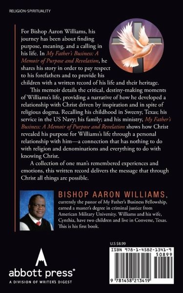For Bishop Aaron Williams, his journey has been about finding purpose, meaning, and a calling in his life. In My Father's Business: A Memoir of Purpose and Revelation, he shares his story in order to pay respect to his forefathers and to provide his children with a written record of his life and their heritage. This memoir details the critical, destiny-making moments of Williams's life, providing a narrative of how he developed a relationship with Christ driven by inspiration and in spite of religious dogma. Recalling his childhood in Sweeny, Texas; his service in the US Navy; his family; and his ministry, My Father's Business: A Memoir of Purpose and Revelation shows how Christ revealed his purpose for Williams's life through a personal relationship with him-a connection that has nothing to do with religion and denominations and everything to do with knowing Christ. A collection of one man's remembered experiences and emotions, this written record delivers the message that through Christ all things are possible.