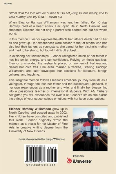 "What doth the lord require of man but to act justly, to love mercy, and to walk humbly with thy God."-Micah 6:8 When Eleanor Ramsay Williamson was ten, her father, Kerr Craige Ramsay, died of a heart attack. Her idyllic life in North Carolina was shattered. Eleanor lost not only a parent who adored her, but her whole world. In this memoir, Eleanor explores the effects her father's death had on her as she grew up. Her experiences were similar to that of others who had also lost their fathers as youngsters: she cared for her alcoholic mother and tried to be strong, but found it difficult at best. In exploring her relationships, Eleanor recognized much of her father in her: his smile, energy, and self-confidence. Relying on these qualities, Eleanor unshackled the restraints placed on women of that era and blazed her own trail. She even married a Yankee, Sterling Rudolph Williamson, and later developed her passions for literature, foreign cultures, and teaching. This insightful memoir follows Eleanor's emotional journey from life as a youngster, through the loss her father and the subsequent upheaval, to her own experiences as a mother and wife, and finally her blossoming into a passionate teacher of international students. With My Father's Daughter, you will experience the events of Eleanor's life as she plucks the strings of your subconscious emotions with her keen observations.