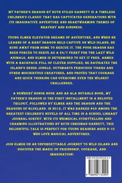 My Father's Dragon by Ruth Stiles Gannett is a timeless children's classic that has captivated generations with its imaginative adventure and heartwarming themes of bravery and kindness. Young Elmer Elevator dreams of adventure, and when he learns of a baby dragon held captive on Wild Island, he runs away from home to rescue it. The poor dragon has been forced to serve as a 24/7 ferry ¿¿ for the lazy wild animals , and Elmer is determined to set it free. Armed with a backpack full of clever supplies, he navigates the island's dense jungle, outsmarts ferocious tigers and other mischievous creatures, and proves that courage and quick thinking can overcome even the wildest challenges. A Newbery Honor Book and an ALA Notable Book, My Father's Dragon is the first installment in a beloved trilogy, followed by Elmer and the Dragon and The Dragons of Blueland. In 2012, it was ranked #49 among the greatest children's novels of all time in a School Library Journal survey. With its whimsical storytelling and charming illustrations by Ruth Chrisman Gannett, this delightful tale is perfect for young readers ages 6-10 who love magical adventures ¿. Join Elmer on an unforgettable journey to Wild Island and discover the magic of friendship, courage, and imagination!