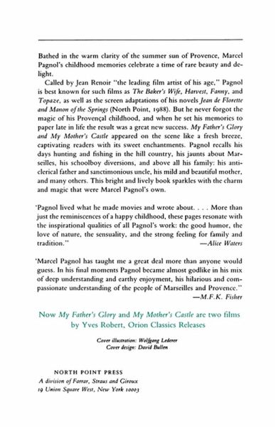 Bathed in the warm clarity of the summer sun in Provence, Marcel Pagnol's childhood memories celebrate a time of rare beauty and delight.Called by Jean Renoir "the leading film artist of his age," Pagnol is best known for such films as The Baker's Wife, Harvest, Fanny, and Topaze, as well as the screen adaptations of his novels Jean de Florette and Manon of the Springs (North Point, 1988). But he never forgot the magic of his Provencal childhood, and when he set his memories to paper late in life the result was a great new success. My Father's Glory and My Mother's Castle appeared on the scene like a fresh breeze, captivating readers with its sweet enchantments. Pagnol recalls his days hunting and fishing in the hill country, his jaunts about Marseilles, his schoolboy diversions, and above all his family: his anticlerical father and sanctimonious uncle, his mild and beautiful mother, and many others. This bright and lively book sparkles with the charm and magic that were Marcel Pagnol's own.