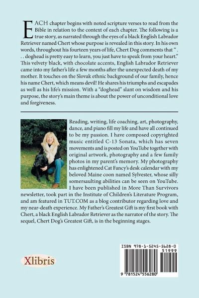 Each chapter begins with noted scripture verses to read from the Bible in relation to the context of each chapter. The following is a true story, as narrated through the eyes of a black English Labrador retriever named Chert whose purpose is revealed in this story. In his own words, throughout his fourteen years of life, Chert Dog comments that " . . . doghead is pretty easy to learn, you just have to speak from your heart." This velvety black, with chocolate accents, English Labrador retriever came into my father’s life a few months after the unexpected death of my mother. It touches on the Slovak ethnic background of our family, hence his name Chert, which means devil! He shares his triumphs and escapades as well as his life’s mission. With a "doghead" slant on wisdom and his purpose, the story’s main theme is about the power of unconditional love and forgiveness.