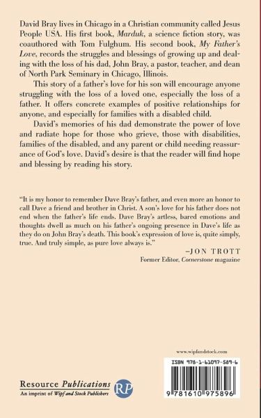 David Bray lives in Chicago in a Christian community called Jesus People USA. His first book, Marduk, a science fiction story, was co-authored with Tom Fulghum. His second book, My Father's Love, records the struggles and blessings of growing up and dealing with the loss of his dad, John Bray, a pastor, teacher, and dean of North Park Seminary in Chicago, Illinois. This story of a father's love for his son will encourage anyone struggling with the loss of a loved one, especially the loss of a father. It offers concrete examples of positive relationships for anyone, and especially for families with a disabled child. David's memories of his dad demonstrate the power of love and radiate hope for those who grieve, those with disabilities, families of the disabled, and any parent or child needing reassurance of God's love. David's desire is that the reader will find hope and blessing by reading his story.