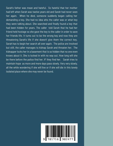 Sarah's father was mean and hateful. So hateful that her mother had left when Sarah was twelve years old and Sarah had never seen her again. When he died, someone suddenly began calling her demanding a key. She had no idea who the caller was or what key they were talking about. She searched and finally found a key that had been hidden for years. The caller told Sarah that he had her friend held hostage so she gave the key to the caller in order to save her friends life. It turns out to be the wrong key and now they are threatening Sarah's life if she doesn't give them the correct key. Sarah has to begin her search all over again. The police are involved but still, the caller manages to kidnap Sarah and threaten her. The kidnapper locks her in a basement that is so hidden that no one even knows about it. She is locked in with no way out. How long will she be there before the police find her. IF they find her. Sarah tries to maintain hope as more and more days pass slowly. Very very slowly, all the while wondering if she will live or if she will die in this lonely isolated place where she may never be found