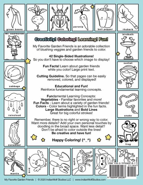 Creativity! Coloring! Learning! Fun! My Favorite Garden Friends is an adorable collection of blushing veggies and garden friends to color. 42 Single-Sided Illustrations!* So you don't have to choose which image to put up on display! Fun Facts! Learn about garden friends while you color! Large print text. Large print text.Cutting Guideline. So that pages can be easily removed, colored, and displayed! Educational and Fun! Reinforce fundamental learning concepts. Fundamental Learning Concepts: Vegetables - Familiar favorites and more! Fun Facts - Learn about a variety of garden friends! Colors - Color terms highlighted in the fun facts. Large Illustrations and Bold Lines - Great for big colorful strokes! Printed on: 8.5"x11" 70 lb White Paper *Left page has large print text, the right page has a fun illustration to color. Happy Coloring! (^_^)