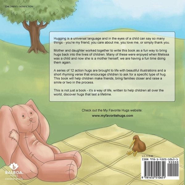 Hugging is a universal language and in the eyes of a child can say so many things - you're my friend, you care about me, you love me, or simply thank you. Mother and daughter have worked together to write this book as a fun way to bring hugs back into the lives of children all over the world. Many of these hugs were enjoyed when Melissa was a child, and now she is a mother herself we are having a fun time doing them again. We wanted to share with you how much fun hugging can be and how it can be done by anyone, anywhere, and the best things about it is that it works both ways and makes everyone feels good. Check out the My Favourite Hugs website: www.myfavoritehugs.com