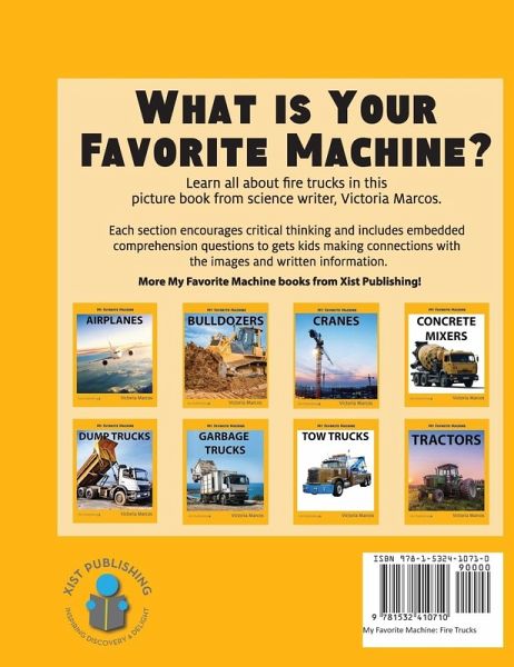 What is your favorite machine? In My Favorite Machine: Fire Trucks, young readers will learn all about fire trucks. This book introduces kids to the different types of fire trucks, how they work and what they do. Sample Text: Fire trucks are big trucks that carry fire fighters and special tools. They carry tools like ladders, hoses, helmets and first aid kits.