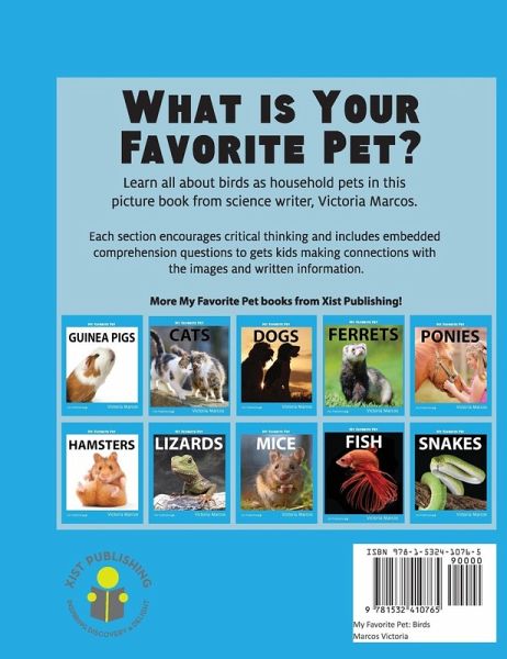 What is your favorite pet? My favorite pets are birds. Would you like to learn about them? In My Favorite Pet: Birds, students will learn about having birds as pets. Each My Favorite Pet book includes information on where pets live, how they play, and what they eat. Sample Text: Pet birds live in cages. Most cages are kept inside the houses of their owners.