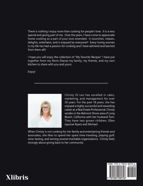 There is nothing I enjoy more than cooking for people I love. It is a very special and giving part of me. Over the years, I have come to appreciate home cooking as a part of your love extended. It nourishes, relaxes, delights, entertains, and is enjoyed by everyone!! Every loving woman in my life has had a passion for cooking and I have admired and learned from them all!! I hope you will enjoy the collection of "My Favorite Recipes" I have put together from my Mom (Nana) my family, my friends, and my own kitchen to share with you and yours. Enjoy!
