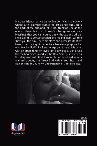 My dear friends, as we try to live our lives in a society where faith is almost prohibited, let us not put God in the back of the bus, and let us not think of God as the one who takes from us. I know God has given you more blessings that you can count, but without our God our life is going to be complicated and meaningless. Let Him show you the way. There are steps and processes that we have to go through in order to achieve our purpose. Let your feet be God's fire. I encourage you to read this book with an open mind for revelation knowledge. Don't rush the reading process and let the Holy Spirit guide you on this daily walk with God. I know life can bombard us with fear and doubts, but, "trust God with all your heart and do not lean on your own understanding" (Proverbs 3:5).