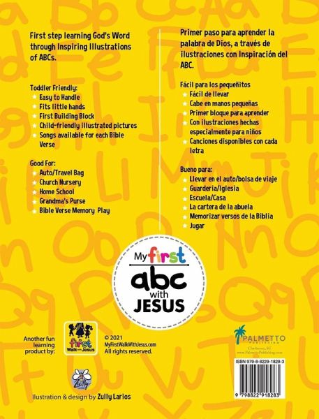 Bilingual ABC book. 70 pages. Designed to help teach tots and young readers their first letters with Bible verses. Two books in one, with ABC's in English, then repeated in Spanish with several added verses. The beautiful illustrations will keep young minds engaged in the learning process with available sing along fun tunes. Ideal for home, school, English Second Language or church classroom."