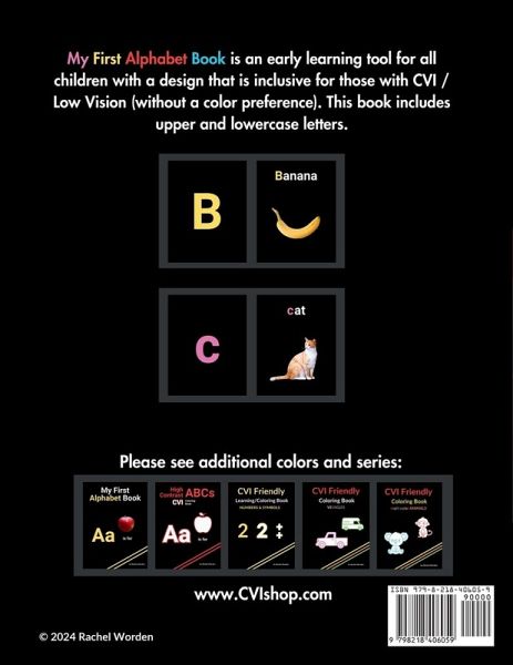 My First Alphabet Book: A Specially Designed Learning Experience for Children with CVI and Low Vision Introduce your child to the world of letters in a fun, engaging, and inclusive way with My First Alphabet Book! Specifically crafted for children with Cortical Visual Impairment (CVI) or low vision, this alphabet book offers an exciting journey of discovery, tailored to empower young learners of all abilities. Unlock the Power of LiteracyLarge Print & High-Contrast Design: With a carefully structured layout, My First Alphabet Book minimizes visual clutter to ensure clear and easy reading, ideal for children with CVI or low vision. Bright and Vibrant Images: Each letter is paired with a high-contrast, real image designed to capture attention and help reinforce visual perception. Inclusive & Supportive Learning: This book fosters an enriching experience that promotes literacy, cognitive development, and sensory engagement. What's Inside?Bold and Colorful Letters: Each page introduces a large, easy-to-read letter alongside an eye-catching, vibrant image of an object that starts with that letter. Real Images & Contrasting Colors: Carefully chosen to maximize visual perception for children with CVI, the images create a joyful, memorable learning environment. Engaging Learning Experience: Objects and sounds are thoughtfully selected to stimulate curiosity and boost literacy skills, encouraging a love for learning. Why Choose My First Alphabet Book?Designed for All Children: Perfect for children with low vision or CVI, as well as early learners. Enrich Your Child's Development: An excellent tool for cognitive and literacy growth, this book is sure to engage and delight young minds. Supportive & Inclusive: Designed to be a valuable resource for fostering positive learning experiences for children with special visual needs. Ignite your child's curiosity and love for learning with My First Alphabet Book.