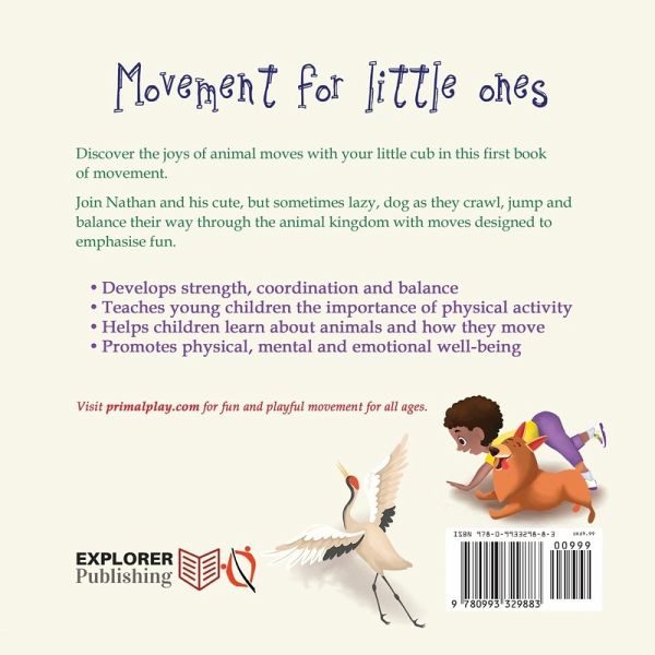 MY FIRST ANIMAL MOVES A Children's Book to Encourage Kids and Their Guardians to Move More, Sit Less and Decrease Screen Time. Nathan loves to play, but he loves his video games more. So can a trip to Animal Moves land convince him there's more fun outdoors? Best-selling author and movement coach Darryl Edwards has created this fun adventure inspired by his passion for encouraging kids to move in an ever-increasing sedentary environment. Discover the joys of animal moves with your little cubs in this first book of movement. Join Nathan and his cute, but sometimes lazy, dog as they crawl, jump and balance their way through the animal kingdom re-enacting moves designed to emphasise fun. It's all in this exercise for kids book that focuses on family fun boredom busters. Do you want to make physical activity for kids fun? Are you looking for ways to help your children develop strength, coordination and balance? Do your children love learning about animals? Are you worried about too much TV and screen time? Do you want to teach young children about the importance of physical activity? Would you like easy and fun fitness games to include in your day? My First Animal Moves is your answer. Play along together, keeping everyone healthier and happier, promoting physical, mental and emotional well-being. You'll all release more mood-enhancing hormones as a result, which help you feel good every day. It's written by professional movement coach and award-winning author Darryl Edwards. My First Animal Moves distils the ideas in his bestselling Animal Moves book and Animal Moves Fitness Decks into a colourful picture book for children. This unique story broadens the perspective of movement with a fun activity for kids that encourages active play for children. So help your kids get outside and play in nature like it's their playground, and don't forget to join in too! Buy My First Animal Moves to help your family thrive through movement today.