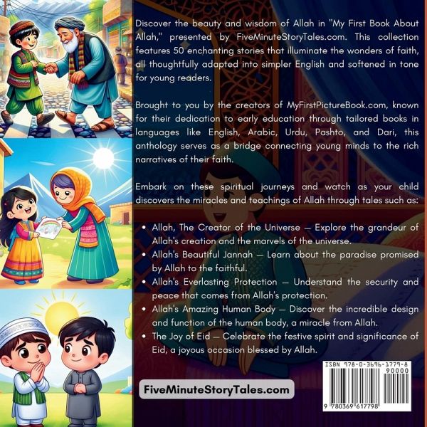 My First Book About Allah - Stories of Faith and Islamic Values Series: Growing Up Muslim - Islamic Teachings for Children Discover the Wonders of Faith! My First Book About Allah is a delightful collection of 50 enchanting stories, perfect for young readers. Each story is thoughtfully adapted into simpler English and softened in tone, making it ideal for children. This book, part of the Growing Up Muslim - Islamic Teachings for Children series, is designed to nurture your child's spiritual growth and understanding. What's Inside?Over 200 pages of enthralling stories that will keep your child captivated for hours. Black and white illustrations accompanying each tale, sparking imagination and bringing the stories to life. Simplified English and gentle language carefully adapted to ensure the stories are both understandable and enjoyable for young readers. Popular Stories Include:Allah, The Creator of the Universe Allah's Beautiful Jannah Allah's Endless Love Allah's Everlasting Protection Allah's Amazing Human Body The Joy of Eid Why You'll Love This Book:Educational and Inspirational: Teaches Islamic values and principles in a fun and engaging way. Perfect for Young Readers: Simplified language and gentle storytelling ensure that young children can understand and enjoy. Beautiful Illustrations: Each story features a black and white illustration that brings the tales to life. Give your child the gift of faith and wonder with My First Book About Allah - a treasured addition to any child's library.