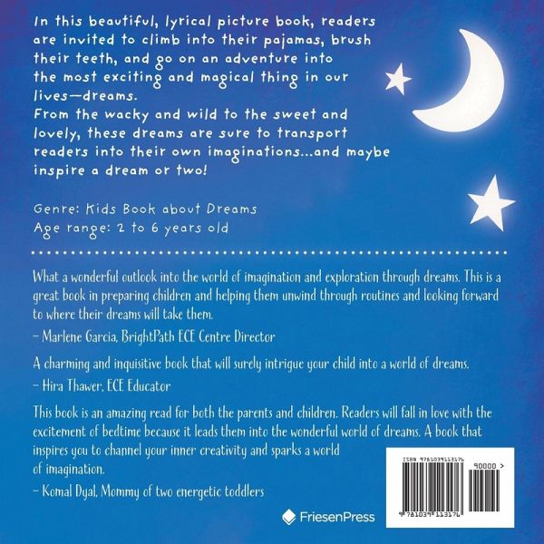 In this beautiful, lyrical picture book, readers are invited to climb into their pajamas, brush their teeth, and go on an adventure into the most exciting and magical thing in our lives-dreams. From the wacky and wild to the sweet and lovely, these dreams are sure to transport readers into their own imaginations...and maybe inspire a dream or two! Genre: Kids Book about Dreams Age range: 2 to 6 years old
