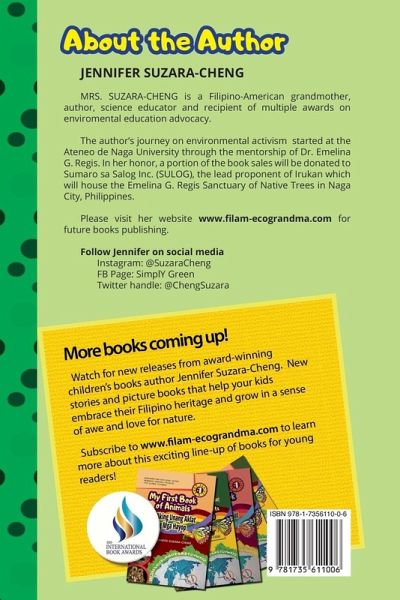Mrs. Jennifer Suzara-Cheng is a Filipino-American grandmother, author, science ducator and recipient of multiple awards on environmental advocacy. It is the author's goal to plant a seed in the minds of the future generations, and make a connection between the children's place of birth and the land of their ancestors using language as a springboard. At the same time, she also wants to open their young eyes to nature by providing pictures instead of cartoonish depictions of living organisms. By doing so, the author sincerely hopes to help awaken in the hearts of new generations of Global Filipinos, love for the PHILIPPINES and the ENVIRONMENT.