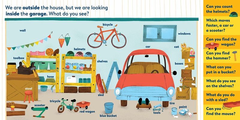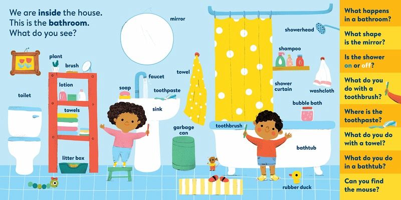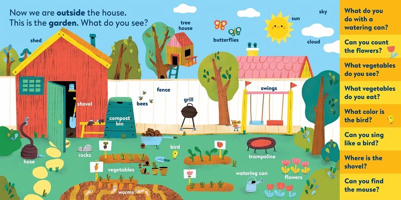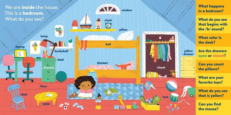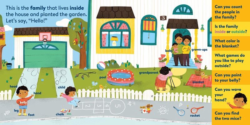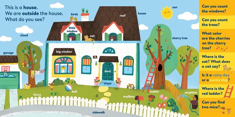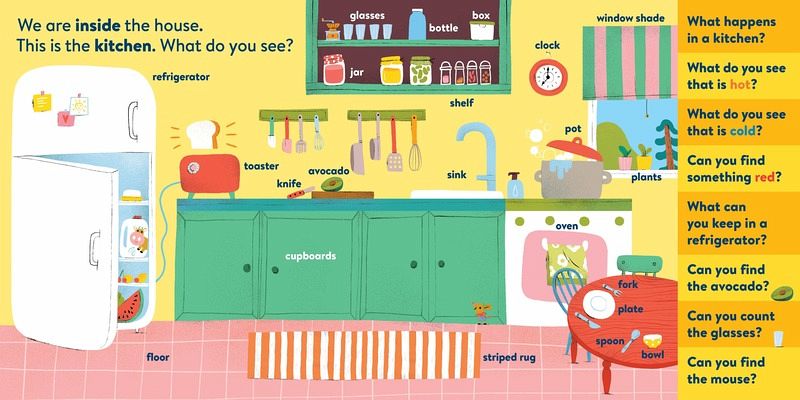 Introduce foundational vocabulary into your child's life for items found all around your home using bright and colorful pictures in Brain Quest's signature question and answer format. My First Brain Quest First Words: Around the Home introduces babies and toddlers to more than 100 foundational vocabulary words from scenes in and around a cozy, colorful family home—from the kitchen to the bathroom to the garden. In addition to labeled illustrated objects, each scene has questions that help reader and child talk about what they see on the page. There’s counting, colors, comparison and more!