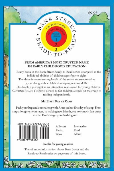 Pack your bag and come along with Anna on her first day of camp. From sing-a-longs to swim races, to making new friends, see how much fun camp can be. Don't forget your bathing suit…. About¿The¿Bank¿Street Ready-To-Read Series More than seventy years of educational research and innovative teaching have given the Bank Street College of Education the reputation as America's most trusted name in early childhood education. Because no two children are exactly alike in their development, we have designed the Bank Street Ready-to-Read series in three levels to accommodate the individual stages of reading readiness of children ages four through eight. • Level 1: Getting Ready To Read- (Pre-K to Grade 1) Books are perfect for reading aloud with children who are getting ready to read or are just beginning to read words or phrases. • Level 2: Reading Together-(Grades 1 to 3) Books are written especially for children who are on their way to reading independently but who may need help. • Level 3: I Can Read It Myself-(Grades 2 to 3) Books are designed for children able to read on their own. They also can be enjoyed as read-alouds. Our three levels make it easy to select the books most appropriate for a child's development and enable him or her to grow with the series step by step. The Bank Street Ready-to-Read books also overlap and reinforce each other, further encouraging the reading process. We feel that making reading fun and enjoyable is the single most important thing that you can do to help children become good readers. And we hope you'll be a part of Bank Street's long tradition of learning through sharing. -The Bank Street College of Education