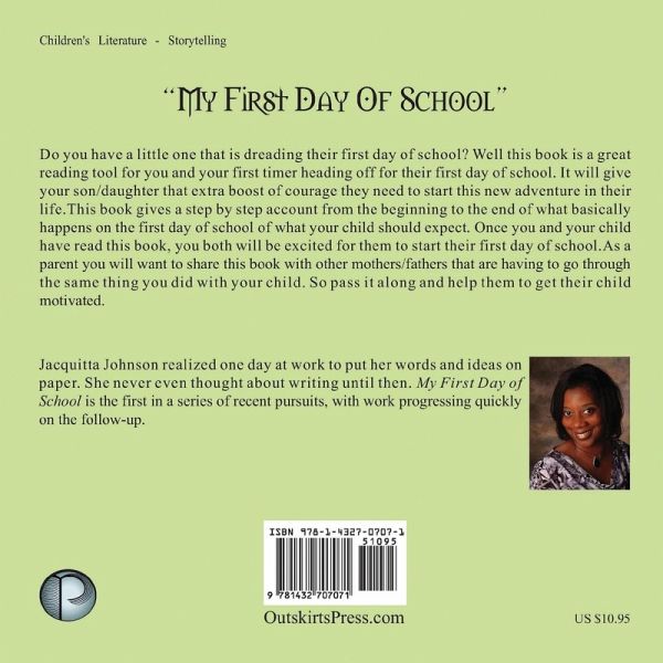 " My First Day Of School" Do you have a little one that is dreading their first day of school? Well this book is a great reading tool for you and your first timer heading off for their first day of school. It will give your son/daughter that extra boost of courage they need to start this new adventure in their life.This book gives a step by step account from the beginning to the end of what basically happens on the first day of school of what your child should expect. Once you and your child have read this book, you both will be excited for them to start their first day of school.As a parent you will want to share this book with other mothers/fathers that are having to go through the same thing you did with your child. So pass it along and help them to get their child motivated.