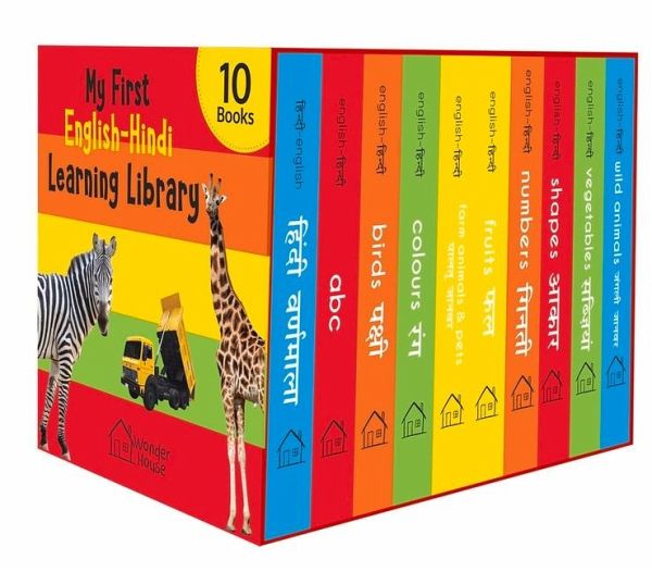 Learn Two Languages with One Box! The English-Hindi Learning Library is a vibrant collection of 10 bilingual board books designed to introduce toddlers and early learners to foundational concepts in both English and Hindi. Each book features well-researched, colorful images with clear word labels in both languages to make early learning fun, easy, and interactive. Covering a wide range of everyday topics, this dual-language boxed set helps children develop essential vocabulary, observation skills, and early literacy--all while fostering cultural awareness through language. What's Inside: * 10 board books on key topics: ABC, Hindi Varnmala, Numbers, Colors, Shapes, Wild & Farm Animals, Birds, Fruits, Vegetables * Bilingual labels in English and Hindi on every page * Bright, engaging images that attract young learners Why Parents & Educators Will Appreciate It: * Builds early bilingual vocabulary and language skills * Encourages interactive learning and parent-child bonding * Perfect for homeschooling, classrooms, and gifting Why Kids Will Love It: * Colorful visuals that make learning exciting * Simple and relatable topics for real-world recognition * Chunky, easy-to-hold board books for tiny hands Product Features: * Durable board book format with rounded edges * Ideal for toddlers and preschoolers * Develops observation, comprehension, and language fluency Perfect For: * Introducing foundational learning topics in two languages * Strengthening Hindi and English language skills * Early learners at home or in preschool