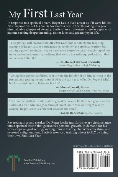 In response to a spiritual dream, Roger Leslie lived a year as if it were his last. New inspirations set his course for success, while heartbreaking loss gave him a palpable glimpse of eternity. Leslie shares his journey here as a guide for anyone seeking deeper meaning, richer love, and greater joy in life.