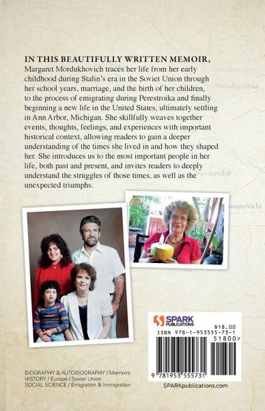 "A powerful story of resilience that provides firsthand insights into life in the Soviet Union." - Kirkus Review In this beautifully written memoir, Margaret Mordukhovich traces her life from her early childhood during Stalin's era in the Soviet Union through her school years, marriage, and the birth of her children, to the process of emigrating during Perestroika and finally beginning a new life in the United States, ultimately settling in Ann Arbor, Michigan. She skillfully weaves together events, thoughts, feelings, and experiences with important historical context, allowing readers to gain a deeper understanding of the times she lived in and how they shaped her. She introduces us to the most important people in her life, both past and present, and invites readers to deeply understand the struggles of those times, as well as the unexpected triumphs.