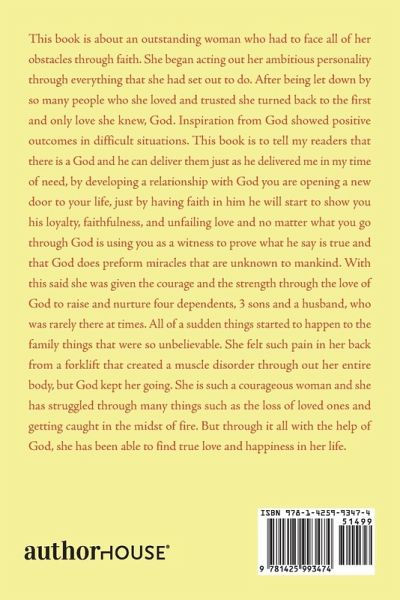 This book is about an outstanding woman who had to face all of her obstacles through faith. She began acting out her ambitious personality through everything that she had set out to do. After being let down by so many people who she loved and trusted she turned back to the first and only love she knew, God. Inspiration from God showed positive outcomes in difficult situations. This book is to tell my readers that there is a God and he can deliver them just as he delivered me in my time of need, by developing a relationship with God you are opening a new door to your life, just by having faith in him he will start to show you his loyalty, faithfulness, and unfailing love and no matter what you go through God is using you as a witness to prove what he say is true and that God does preform miracles that are unknown to mankind. With this said she was given the courage and the strength through the love of God to raise and nurture four dependents, 3 sons and a husband, who was rarely there at times. All of a sudden things started to happen to the family things that were so unbelievable. She felt such pain in her back from a forklift that created a muscle disorder through out her entire body, but God kept her going. She is such a courageous woman and she has struggled through many things such as the loss of loved ones and getting caught in the midst of fire. But through it all with the help of God, she has been able to find true love and happiness in her life.
