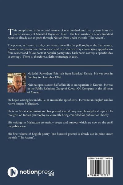 This compilation is the second volume of one hundred and five poems from from the poetic armoury of Madathil Rajendran Nair. The first instalment of one hundred poems is already out in print through Notion Press under the title "The Ascent". The poems, in free-verse style, cover several areas like the philosophy of the East, nature, romanticism, patriotism, humour etc. and have received very encouraging approbation from readers and fellow poets at popular poetry sites. Each poem conveys a specific idea or concept. There is, therefore, a definite message in each.