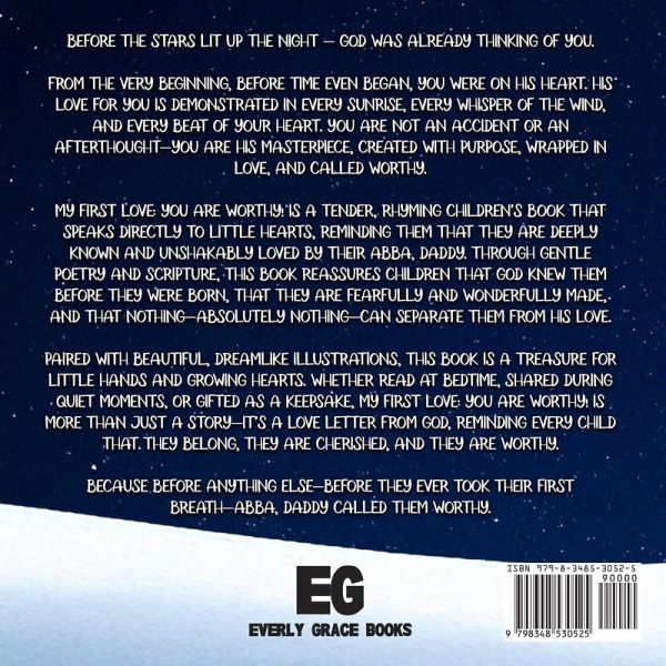 Before the stars lit up the night - God was already thinking of YOU. From the very beginning, before time even began, you were on His heart. His love for you is DEMONSTRATED IN every sunrise, every whisper of the wind, and every beat of your heart. You are not an accident or an afterthought-you are His masterpiece, created with purpose, wrapped in love, and called worthy. My First Love: You Are Worthy! is a tender, rhyming children's book that speaks directly to little hearts, reminding them that they are deeply known and unshakably loved by their Abba, Daddy. Through gentle poetry and scripture, this book reassures children that God knew them before they were born, that they are fearfully and wonderfully made, and that nothing-absolutely nothing-can separate them from His love. Paired with beautiful, dreamlike illustrations, this book is a treasure for little hands and growing hearts. Whether read at bedtime, shared during quiet moments, or gifted as a keepsake, My First Love: You Are Worthy! is more than just a story-it's a love letter from God, reminding every child that they belong, they are cherished, and they are worthy. Because before anything else-before they ever took their first breath-Abba, Daddy called them worthy!