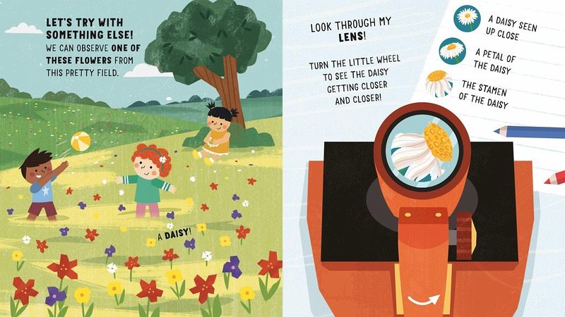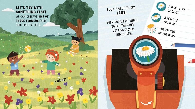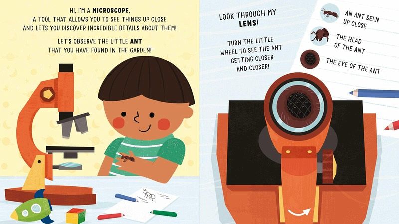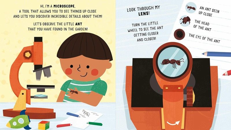 A simple, but effective rotating wheel turns this book into a microscope! On each page, children are able to take a closer look at an ant, a flower, a pile of sand, and a snowflake to find out what they look like up close. They just need to turn the wheel to “zoom in”! Colorful illustrations by Esme Lee, short engaging text, and a book kids can play with are the perfect tools to stimulate their curiosity and desire to explore the natural world.