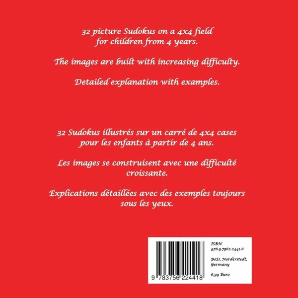 32 picture Sudokus on a 4x4 field for children from 4 years.The images are built with increasing difficulty.Detailed explanation with examples.32 Sudokus illustrés sur un carré de 4x4 cases pour les enfants à partir de 4 ans.Les images se construisent avec une difficulté croissante.Explications détaillées avec des exemples toujours sous les yeux.
