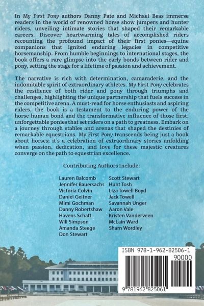In "My First Pony," authors Danny Pate and Michael Beas immerse readers in the world of renowned horse show jumpers and hunter riders, unveiling intimate stories that shaped their remarkable careers. Discover heartwarming tales of accomplished riders recounting the profound impact of their first ponies-equine companions that ignited enduring legacies in competitive horsemanship. From humble beginnings to international stages, the book offers a rare glimpse into the early bonds between rider and pony, setting the stage for a lifetime of passion and achievement. The narrative is rich with determination, camaraderie, and the indomitable spirit of extraordinary athletes. "My First Pony" celebrates the resilience of both rider and pony through triumphs and challenges, highlighting the unique partnership that fuels success in the competitive arena. A must-read for horse enthusiasts and aspiring riders, the book is a testament to the enduring power of the horse-human bond and the transformative influence of those first, unforgettable ponies that set riders on a path to greatness. Embark on a journey through stables and arenas that shaped the destinies of remarkable equestrians. "My First Pony" transcends being just a book about horses; it's a celebration of extraordinary stories unfolding when passion, dedication, and love for these majestic creatures converge on the path to equestrian excellence. Contributing Authors Include: Lauren Balcomb Jennifer Bauersachs Victoria Colvin McLain Ward Daniel Geitner Mimi Gochman Danny Robertshaw Havens Schatt Will Simpson Amanda Steege Don Stewart Scott Stewart Hunt Tosh Liza Towell Boyd JackTowell Savannah Unger Aaron Vale Kristen Vanderveen Sharn Wordley
