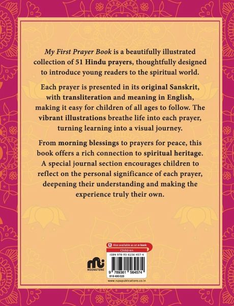 My First Prayer Book is a beautifully illustrated collection of 51 Hindu prayers, thoughtfully designed to introduce young readers to the spiritual world. Each prayer is presented in its original Sanskrit, with transliteration and meaning in English, making it easy for children of all ages to follow. The vibrant illustrations breathe life into each prayer, turning learning into a visual journey. From morning blessings to prayers for peace, this book offers a rich connection to spiritual heritage. A special journal section encourages children to reflect on the personal significance of each prayer, deepening their understanding and making the experience truly their own.