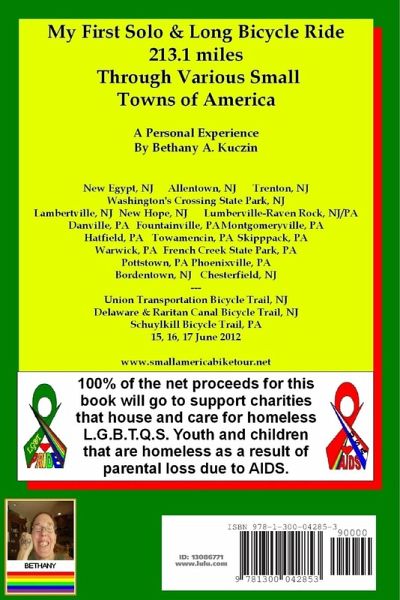 My First Solo & Long Bicycle Ride 213.1 miles Through Various Small Towns of America is A Personal Experience written By Bethany A. Kuczin The book contains all of the information regarding preparation for the trip, how to make my custom made bicycle racks, and the route traveled including places to eat, stay, and visit along the way. 100% of the net proceeds for this book will go to support charities that house and care for homeless L.G.B.T.Q.S. Youth and children that are homeless as a result of parental loss due to AIDS. Towns include: New Egypt, NJ Allentown, NJ Trenton, NJ Washington's Crossing State Park, NJ Lambertville, NJ New Hope, NJ Lumberville-Raven Rock, NJ/PA Danville, PA Fountainville, PA Montgomeryville, PA Hatfield, PA Towamencin, PA Skipppack, PA Warwick, PA French Creek State Park, PA Pottstown, PA Phoenixville, PA Bordentown, NJ Chesterfield, NJ Union Transportation Bicycle Trail, NJ Delaware & Raritan Canal Bicycle Trail, NJ Schuylkill Bicycle Trail, PA